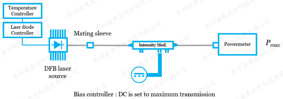 直流偏壓的半波電壓VπDC僅僅適用于強度調制器,而非相位調制器(無偏壓接口)。VπDC是電光調制器,通過DC偏壓調節,傳輸的光波引入一個相移所需的電壓。對于強度調制器,即M-Z干涉儀,半波電壓(Vπ)對應為將光輸出功率從最大Pmax改變為最小Pmin時的DC偏壓值,(參考調制器的傳輸曲線MTF),其測量方法同前面靜態消光比的測量,只不過此時記錄電壓值的差值。