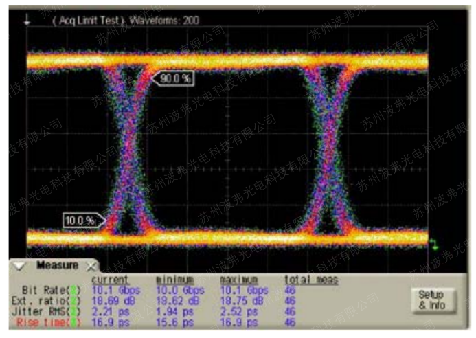 動態消光比的測量需要接入射頻RF電信號在調制器的射頻端口,并且DC偏壓設置在所做應用的合適工作點上(通常Quad+,Quad-,Min,詳見調制器的偏壓控制文章)。所以,動態消光比是和最終應用相關的。例如數字調制方式(10Gb/s,通過MX-LN-10調制),如下圖,通過PRBS產生射頻電信號,偏壓控制在Quad點上,通過高速示波器,我們測量的眼圖最高和最低水平的比值-動態消光比是18.6dB(見示波器測量數值Ext. Ratio)。