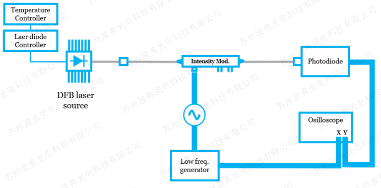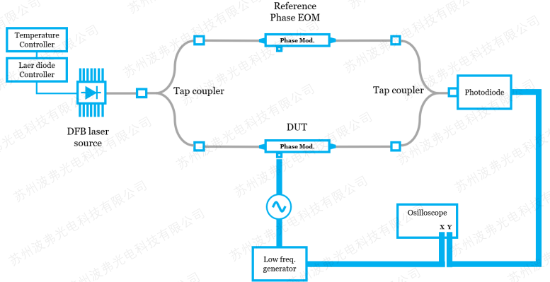 對于相位調制器測量VπRF,必須將相位的變化轉變為強度的變化。這有很多方法:其一包括45度入射相位調制器波導(偏振波導APE工藝不適用,通常iXblue 1um及其以下波長調制器為偏振波導),建議一個干涉儀系統。其二可通過在一路光路中加入相位調制器,建議法布里-珀羅干涉儀。更多方法,請參考我們應用指南”相位調制器帶寬測試”應用指南。
