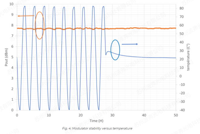 由于激光系統(tǒng)可能需要在戶外和具有挑戰(zhàn)性的環(huán)境中工作,因此對調(diào)制器進(jìn)行了長時間溫度循環(huán)測試。溫度(藍(lán)色曲線)從-40°C到+85°C,并記錄輸出功率(橙色曲線)。通過我們的特殊調(diào)制器工藝,調(diào)制器是非常穩(wěn)定的,我們只觀察到在整個溫度范圍內(nèi)0,2dB的微小變化。