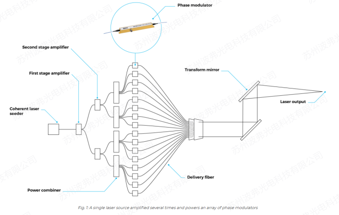 具有窄線寬(kHz量級(jí))的單一激光器被多級(jí)光纖放大器放大幾倍的功率,并饋送到相位調(diào)制器上(每個(gè)激光通道上放置一個(gè)相位調(diào)制器),對(duì)每個(gè)通道光束分別應(yīng)用相位校正。調(diào)制器動(dòng)態(tài)地校正光路的相位差,并保持輸出激光束的空間和時(shí)間特性。換言之,通過實(shí)時(shí)控制多個(gè)激光器的相對(duì)相位來組合多個(gè)激光器,可以永久地保持干涉的最大化,從而保證合成期間的最大功率效率。