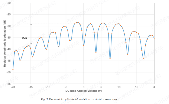調(diào)制器也是直流耦合器件,這意味著您可以施加直流電壓以最小化剩余振幅調(diào)制(RAM)效應(yīng)(iXblue Photonics專利技術(shù),US2016109734A1,“”Electro-optical phase modulator and modulation method”)。下圖顯示了施加直流電壓時(shí)測(cè)量的RAM值。結(jié)果表明,通過簡(jiǎn)單地給調(diào)制器增加一個(gè)直流分量,就可以將剩余幅度調(diào)制減少10倍或更多。