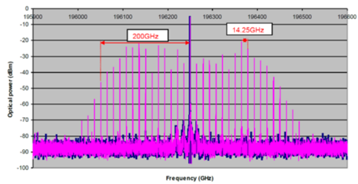 基于鈮酸鋰電光調制器所產生的光學頻率梳,原理是通過鈮酸鋰相位調制器(Phase Modulator),鈮酸鋰強度調制器(Intensity Modulator)的邊帶產生(參考微信公眾號:使用電光調制器實現邊帶調制),通過串聯鈮酸鋰相位調制器、強度調制器實現高平坦度(~2dB),多梳線光學頻率梳產生,最終產生上百個梳線的頻率梳。基于鈮酸鋰調制器產生的光學頻率梳具有中心頻率已于調節,重復頻率可控等優勢。