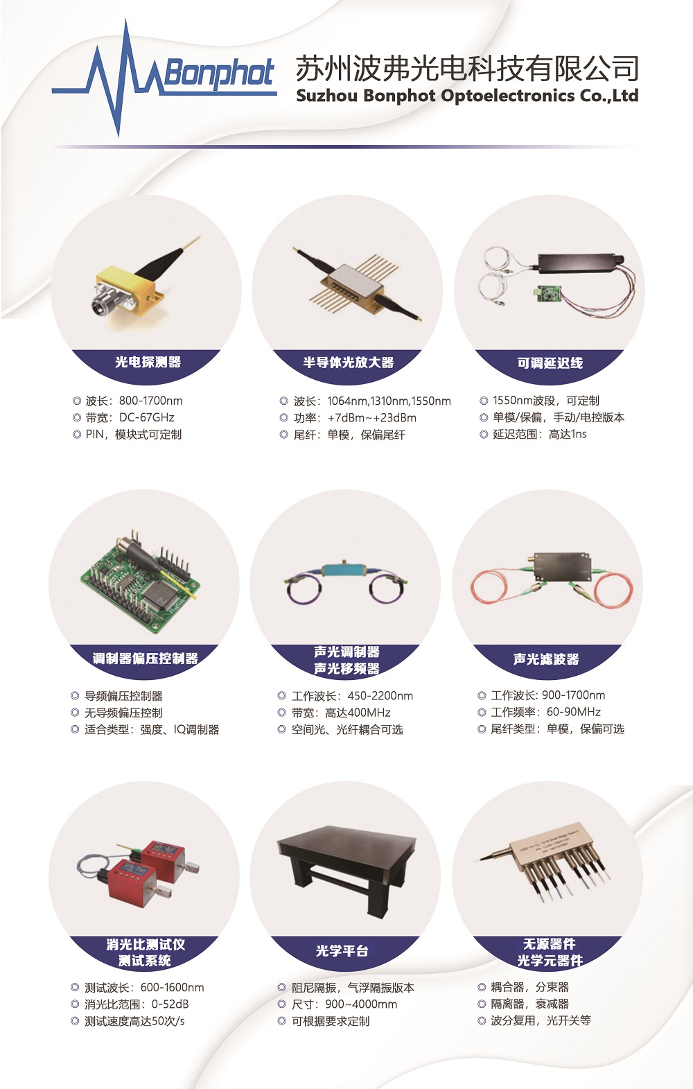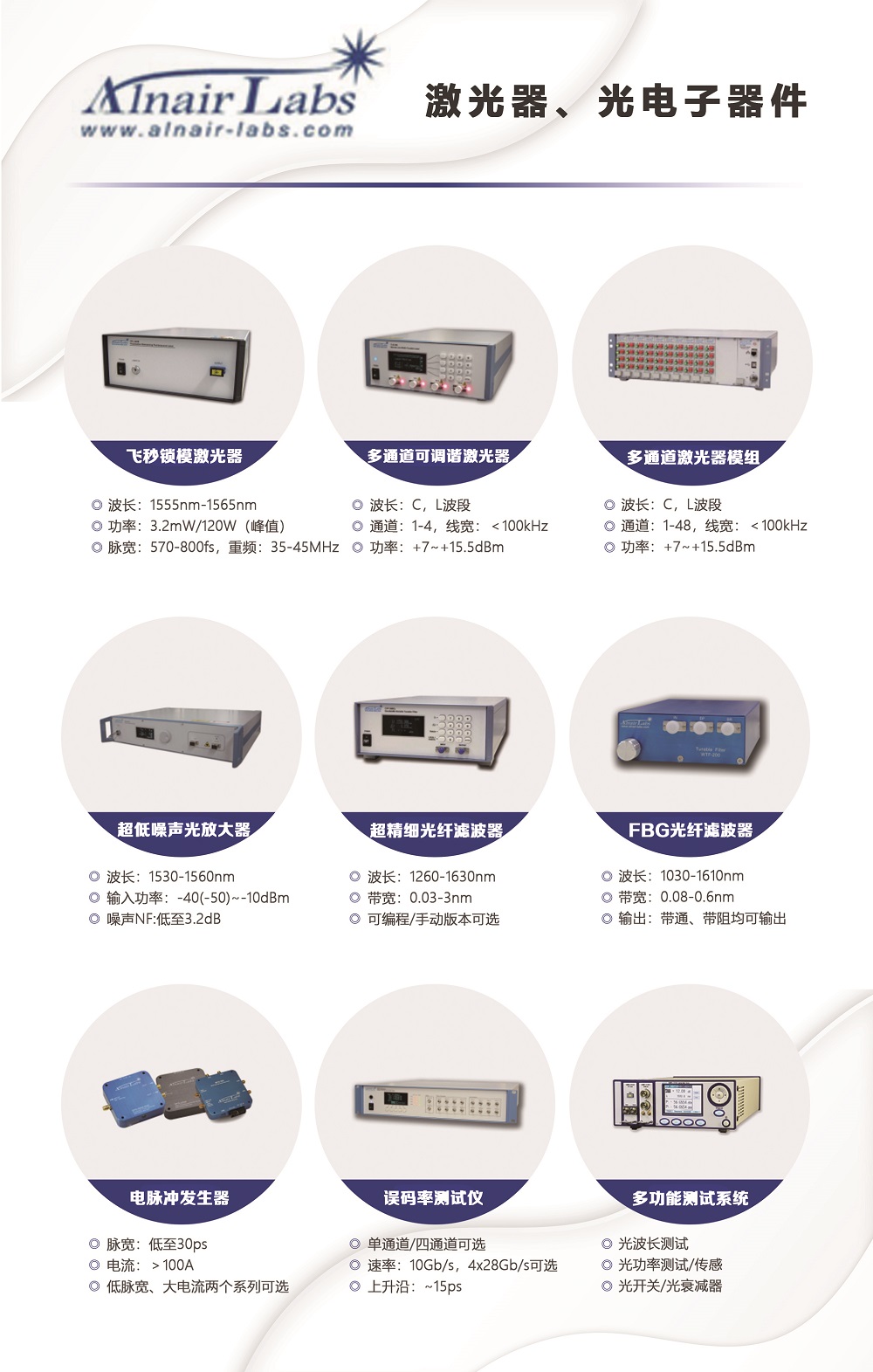目前提供的主要產品:激光器,寬帶光源,電光調制器(大量現貨庫存),聲光調制產品,光放大器,光電探測器/接收器,高速光開關/開關矩陣,光纖濾波器,光學延遲線,偏振相關器件,自相關儀,光譜分析儀,太赫茲相關器件,高速電子產品,數據采集卡,激光二極管,激光器驅動,光纖及光纖熔接處理,光纖干涉儀,氣室/氣池,光學相干斷層掃描系統,相機,OCT光譜儀,掃描振鏡,MEMS振鏡,光機械器件,光學平臺。