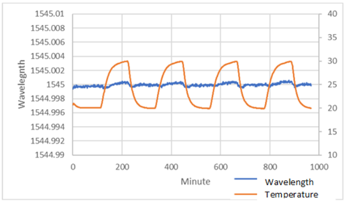 環境溫度在10°C范圍內循環時,范圍內任何位置的一般波長的波長與時間的關系。總漂移小于1pm。ClarityPlus可以為C波段的任何波長生成可追溯到NIST的波長。