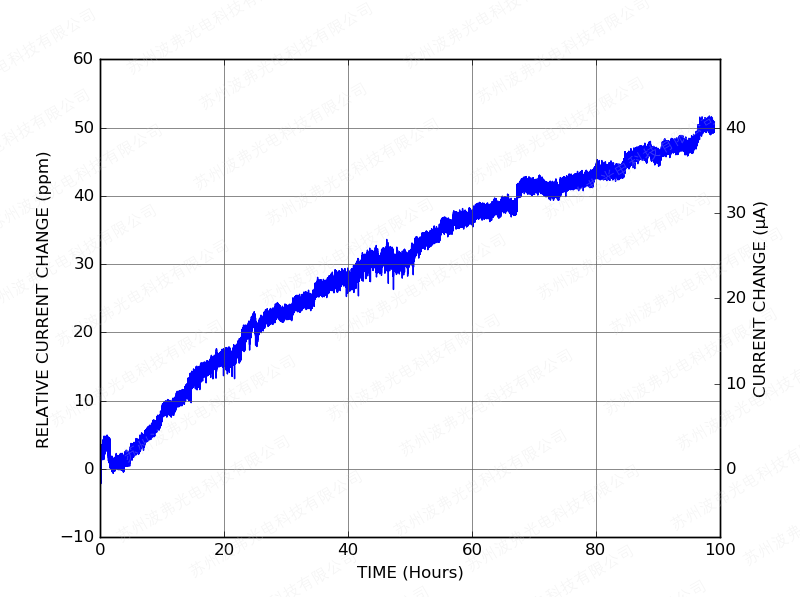 下圖顯示了CTL101激光控制器設置為800 mA電流(CTL101-2-B-800)在其前100小時運行期間的相對電流變化: