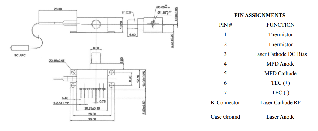 DML系列直接調制激光二極管才有標準單模SMF-28e光纖輸出(可定制保偏尾纖輸出),阻燃涂層,900um套管,標準1m尾纖,5mm PIN腳間隔,已經SC/APC接頭(可定制)。
